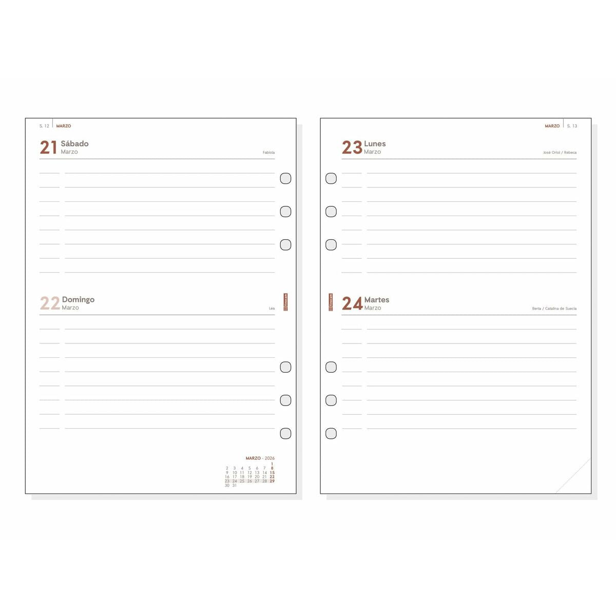 The Finocam OPEN R1097 agenda refill is an essential component designed for ring-bound agendas in the Open range, intended to cover the year 2026 with a practical and functional format. This refill features dimensions of 15.5 x 21.5 cm, an ideal size for easy handling and comfort in both professional and personal settings. It is made with 80 g/m² chlorine-free certified paper, ensuring optimal quality and durability while maintaining clean and sharp writing. The binding includes 6 punched holes for perfect fitting in compatible ring agendas. Its design offers a layout of 2 days per page, facilitating detailed and ample organization of daily tasks and appointments. Additionally, it includes a fold-out annual planner, providing a global view of the year for faster, strategic planning. The refill also incorporates supplementary information on name days (except Portuguese edition), national holidays, and seasonal changes, as well as the start of the Chinese, Muslim, Orthodox, and Hebrew new years, enriching the content for users with diverse interests. It completes the annual cycle with two complementary months in a biweekly overview format, offering an initial and final summary to ease smooth transitions between years. This product is aimed at those who need a reliable and organized support to improve daily management by using a product that combines functionality, quality, and adaptability, typical of the Finocam catalog, a brand recognized for enhancing personal organization with practical, well-designed items. The Finocam OPEN R1097 refill is an effective and well-equipped option to keep your agenda updated throughout the year with comfort and precision.
